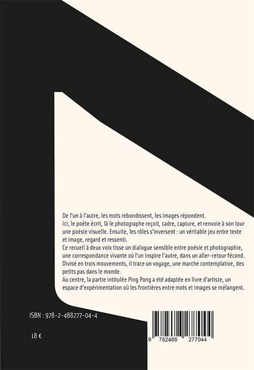 Les mots jaillissent, les images répondent. Le poète écrit et le photographe reçoit, cadre, capture et renvoie une poésie visuelle. Puis, les rôles s’inversent : un jeu entre texte et image. Ce recueil à deux voix tisse un dialogue entre poésie et photographie, une correspondance où l’un inspire l’autre, dans un aller-retour fécond. Divisé en trois mouvements, il trace un voyage.