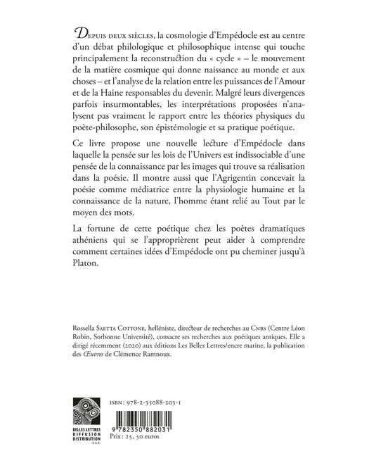 Depuis deux siecles, la cosmologie d'Empedocle est au centre d'un debat philologique et philosophique intense qui touche principalement la reconstruction du cycle - le mouvement de la matiere cosmique qui donne naissance au monde et aux choses - et l'analyse de la relation entre les puissances de l'Amour et de la Haine responsables du devenir. Malgre leurs divergences parfois insurmontables, les interpretations proposees n'analysent pas vraiment le rapport entre les theories physiques du poete-philosophe, son epistemologie et sa pratique poetique. Ce livre propose une nouvelle lecture d'Empedocle dans laquelle la pensee sur les lois de l'Univers est indissociable d'une pensee de la connaissance par les images qui trouve sa realisation dans la poesie. Il montre aussi que l'Agrigentin concevait la poesie comme mediatrice entre la physiologie humaine et la connaissance de la nature, l'homme etant relie au Tout par le moyen des mots. La fortune de cette poetique chez les poetes dramatiques atheniens qui se l'approprierent peut aider a comprendre comment certaines idees d'Empedocle ont pu cheminer jusqu'a Platon.