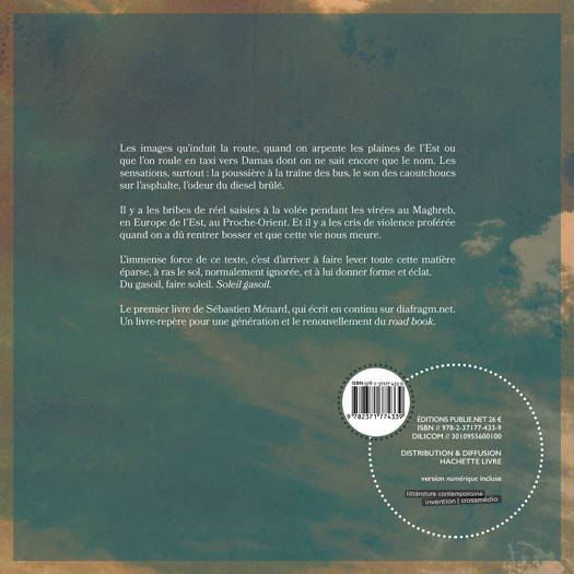 Les images qu’induit la route, quand on arpente les plaines de l’Est ou que l’on roule en taxi vers Damas dont on ne sait encore que le nom. Les sensations, surtout : la poussière à la traîne des bus, le son des caoutchoucs sur l’asphalte, l’odeur du diesel brûlé. Il y a les bribes de réel saisies à la volée pendant les virées au Maghreb, en Europe de l’Est, au Proche-Orient. Et il y a les cris de violence proférée quand on a dû rentrer bosser et que cette vie nous meure. L’immense force de ce texte, c’est d’arriver à faire lever toute cette matière éparse, à ras le sol, normalement ignorée, et à lui donner forme et éclat. Du gasoil, faire soleil. Soleil gasoil. Le premier livre de Sébastien Ménard, qui écrit en continu sur diafragm.net. Un livre-repère pour une génération et le renouvellement du road book.