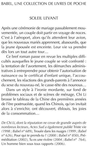 De Chi Li, dont la réputation ne cesse de grandir auprès de nombreux lecteurs, Actes Sud a également publié Triste vie (1998 ; Babel n° 689), Trouée dans les nuages (1999 ; Babel n° 626), Pour qui te prends-tu ? (2000 ; Babel n° 850), Préméditation (2002), Tu es une rivière (2004 ; Babel n° 764), Un homme bien sous tous rapports (2006).