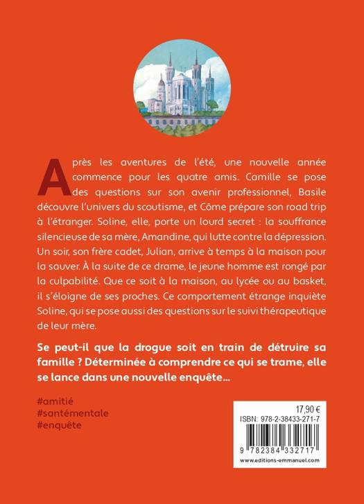 Après les aventures de l’été dernier, les quatre amis font leur rentrée à la fac. Une nouvelle année commence. Alors que Camille se pose des questions sur son avenir professionnel, Basile découvre l’univers du scoutisme et Côme prépare son road trip en Asie. Soline, elle, cache un lourd secret. Depuis plusieurs années, sa mère, Amandine, souffre de dépression. La jeune femme garde toute cette souffrance enfouie en elle depuis longtemps. Un soir, son frère cadet, Julian, arrive à temps à la maison pour sauver leur mère. A la suite de ce drame, le jeune homme est rongé par les événements. Que ce soit au lycée ou au basket, il s’éloigne de tous ses proches. Alors que Soline se questionne sur le suivi thérapeutique de sa mère, elle parvient à s’ouvrir peu à peu à Basile. Mais l’attitude de son frère l’inquiète tout autant. Se peut-il que la drogue soit en train de détruire sa famille ? Avec le soutien de ses amis, elle va alors pouvoir mener une nouvelle enquête !