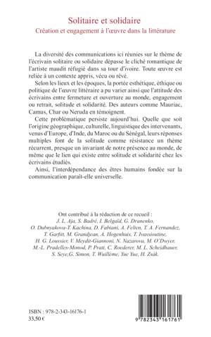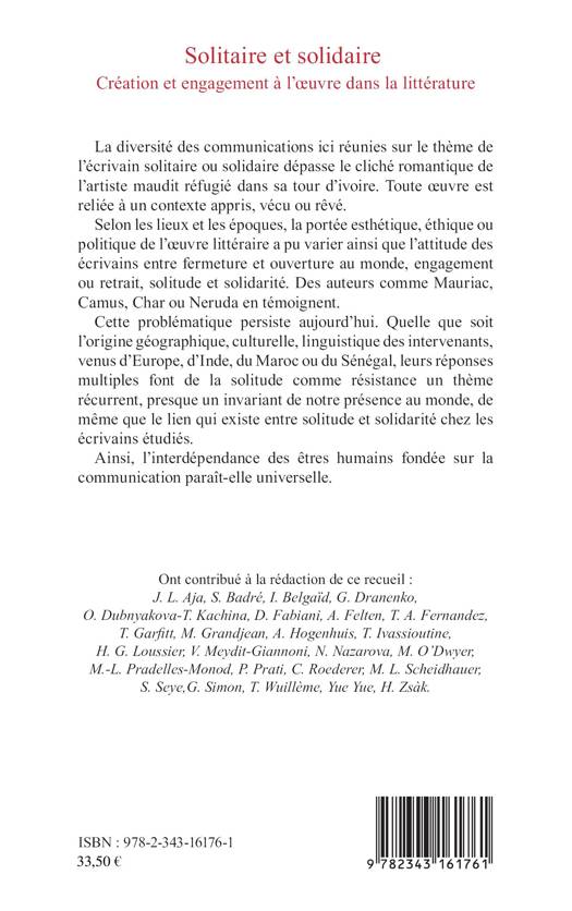 La diversité des communications ici réunies sur le thème de l'écrivain solitaire ou solidaire dépasse le cliché romantique de l'artiste maudit réfugié dans sa tour d'ivoire. Toute oeuvre est reliée à un contexte appris, vécu ou rêvé. Selon les lieux et les époques, la portée esthétique, éthique ou politique de l'oeuvre littéraire a pu varier à l'instar de l'attitude des écrivains entre fermeture et ouverture au monde, engagement ou retrait, solitude et solidarité. Cette problématique persiste aujourd'hui. Quelle que soit l'origine géographique, culturelle, linguistique des intervenants, venus d'Europe, d'Inde, du Maroc ou du Sénégal, leurs réponses multiples font de la solitude comme résistance un thème récurrent, presque un invariant de notre présence au monde.