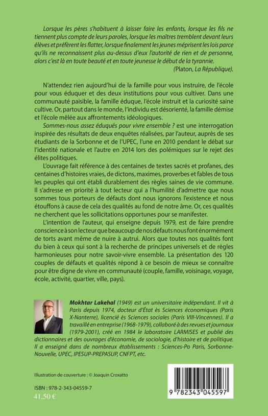 Dans une communauté paisible, la famille éduque, l'école instruit et la curiosité saine cultive. Or, partout, l'individu est désorienté, la famille démise et l'école mêlée aux affrontements idéologiques. Ce livre fait référence à des textes sacrés et profanes, des histoires vraies, et des fables qui ont établi dans le monde des règles saines de vie commune et présente 120 couples de défauts et qualités pour mieux se connaître et être digne de vivre en communauté (couple, famille, voisinage, école, ville, pays, tourisme...)