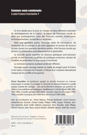 Ce livre plaide pour la prise en compte de deux éléments essentiels du développement de la France: le thème de l'exclusion sociale et, dans son prolongement, celui des fractures sociales, numériques, environnementales, territoriales et sociétales. Dans une première partie, l'ouvrage traite de l'émergence, de l'évolution de ce concept et de cette approche en termes de fracture sociale, durant ces quarante dernières années. Une fracture sociale qui devient un phénomène pluridimensionnel et généralisé. La seconde partie examine les diverses politiques anti-exclusion sociale et anti-fractures, qualifiées de politiques inclusives, tentant de modifier en profondeur le tissu social et territorial. La conclusion propose quelques pistes de réflexion. Ouvrage ouvert, ouvrage inquiet, en quête de progrès pour la France et de mieux vivre pour les Français, à l'heure d'un contexte international marqué par les conflits et les guerres.