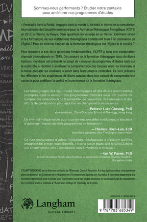 Pour répondre à ces deux questions fondamentales, l'ICETE a tenu une consultation triennale internationale en 2015. Des acteurs de la formation théologique issus de divers horizons mondiaux ont présenté le projet de « révision du programme d'études axée sur la recherche », destiné à améliorer la compréhension des besoins réels du ministère et à mieux préparer les étudiants à servir dans leurs propres contextes. Ce livre présente les réflexions et les expériences de divers auteurs, dans leur volonté de comprendre leur contexte pour améliorer la qualité et la pertinence de la formation théologique.