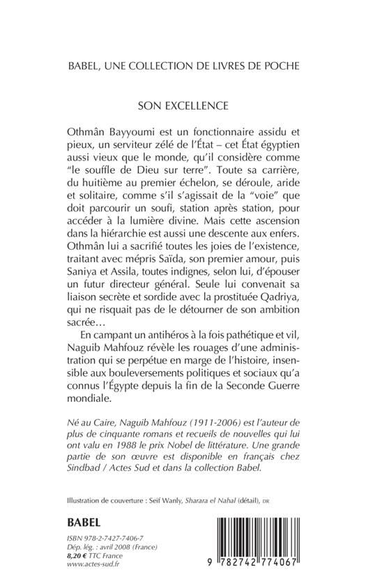 Othmân Bayyoumi est un fonctionnaire assidu et pieux, un serviteur zélé de l'Etat - cet Etat égyptien aussi vieux que le monde, qu'il considère comme "le souffle de Dieu sur terre". Toute sa carrière, du huitième au premier échelon, se déroule, aride et solitaire, comme s'il s'agissait de la "voie" que doit parcourir un soufi, station après station, pour accéder à la lumière divine. Mais cette ascension dans la hiérarchie est aussi une descente aux enfers. Othmân lui a sacrifié toutes les joies de l'existence, traitant avec mépris Saïda, son premier amour, puis Saniya et Assila, toutes indignes, selon lui, d'épouser un futur directeur général. Seule lui convenait sa liaison secrète et sordide avec la prostituée Qadriya, qui ne risquait pas de le détourner de son ambition sacrée... En campant un antihéros à la fois pathétique et vil, Naguib Mahfouz révèle les rouages d'une administration qui se perpétue en marge de l'histoire, insensible aux bouleversements politiques et sociaux qu'a connus l'Egypte depuis la fin de la Seconde Guerre mondiale. Né au Caire, Naguib Mahfouz (1911-2006) est l'auteur de plus de cinquante romans et recueils de nouvelles qui lui ont valu en 1988 le prix Nobel de littérature. Une grande partie de son oeuvre est disponible en français chez Sindbad / Actes Sud et dans la collection Babel.