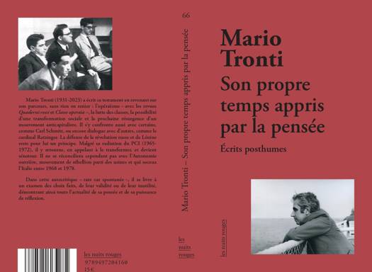 Mario Tronti (1931-2023), a milité toute sa vie au PCI puis au PDS et enfin au PD. Il a néanmoins fondé et animé deux revues opéraïstes, de grande importance, Quaderni rossi (1961-1963) et Classe operaia (1964-1967). Il a aussi participé à Contropiano (1968-1971). Son Åuvre la plus connue est Operai e Capitale (Ouvriers et Capital) (1966). Le livre est posthume que Mario Tronti souhaitait voire paraître après sa mort. C'est un livre testament au moyen duquel il revisite sa conception du monde au soir de sa vie, ne reniant pas son parcours, la lutte des classes, la possibilité de transformation sociale et la résurgence d'un mouvement antagonique au capital dans les années à venir.