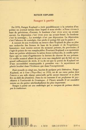 En 1978, Rutger Kopland a écrit parallèlement à la création d'un poème un journal intime dans lequel il nous révèle : "Nous vivons à base de prévisions, d'avenir, le bonheur c'est vivre avec un avenir ouvert. La dépression c'est vivre avec un avenir fermé. Le bonheur c'est la nostalgie... La nostalgie n'est pas dépression. La dépression c'est l'absence de nostalgie, être pieds et poings liés par le passé." À mesure de son évolution on trouve chez Kopland de plus en plus une recherche des formes de base de la pensée et de l'expérience humaines ; tout tourne autour du moment présent, du provisoire ; il s'agit de points de vue remplaçables. Pourtant Kopland a su maintenir dans ses poésies ultérieures la même douce mélancolie, le souffle spécifique qui ne cesse d'agrémenter la lecture de chacun de ses poèmes. Ce souffie musical allant de pair avec une simplicité qui de fait est un grand raffinement de style, il va de soi que la poésie de Kopland est d'une accessibilité remarquable à première vue : le mystérieux est plutôt localisé dans l'évidence que dans l'exceptionnel.