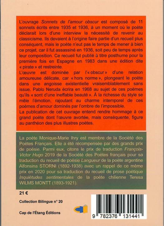 L’ouvrage Sonnets de l’amour obscur est composé de 11 sonnets écrits entre 1935 et 1936, à un moment où le poète déclarait lors d’une interview la nécessité de revenir au classicisme. Ils devaient à l’origine faire partie d’un recueil plus conséquent, mais le poète n’eut pas le temps de mener à bien ce projet, car il fut assassiné en 1936, soit peu de temps après leur composition. Ce recueil fut publié à titre posthume pour la première fois en Espagne en 1983 dans une édition dite « pirate » et restreinte. L’œuvre est dominée par l’« obscur » d’une relation amoureuse délicate, car « hors norme », plongeant le poète dans une angoisse existentielle vraisemblablement sans issue. Pablo Neruda écrira en 1968 au sujet de ces poèmes qu’ils « sont d’une ineffable beauté ». À la richesse du style se mêle l’émotion, rajoutant au charme intemporel de ces poèmes d’amour dominés par l’ombre de l’impossible. La publication de cet ouvrage entend rendre hommage à ce grand poète dont l’œuvre avortée, mais conséquente, figure au panthéon des plus illustres poètes.