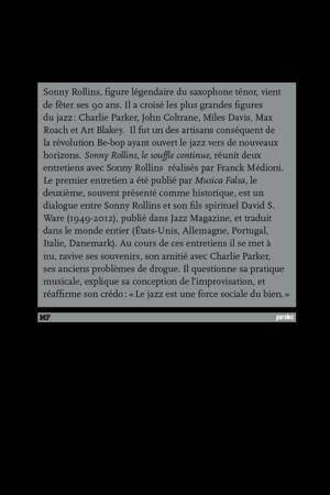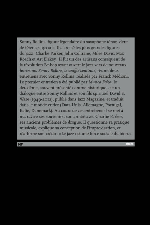 Le saxophoniste ténor Sonny Rollins vient de fêter ses 85 ans. Figure légendaire de la musique noire-américaine, le Colosse du saxophone a croisé les plus grandes figures du jazz : Charlie Parker, John Coltrane, Miles Davis, Thelonious Monk, Max Roach, Art Blakey, Herbie Hancock, Pat Metheny et Ornette Coleman. Le souffle continu réunit deux entretiens avec Sonny Rollins réalisés par Franck Médioni. Le premier entretien a été publié dans Musica Falsa ; le deuxième, souvent présenté comme historique, est un dialogue entre Sonny Rollins et son fils spirituel David S. Ware (1949-2012), publié dans Jazz Magazine, et traduit dans le monde entier (États-Unis, Allemagne, Portugal, Italie, Danemark). Au cours de ces entretiens, il se met à nu. ravive ses souvenirs, son amitié avec Charlie Parker, ses anciens problèmes de drogue. Il révèle l'importance des techniques de respiration circulaire aux sources de l'improvisation comme « exercice spirituel ». Ainsi sous l'influence des sagesses extrême-orientales, l'esprit afro-américain du jazz se renouvelle. Sonny Rollins réaffirme son credo : « le jazz est une force sociale du bien. »