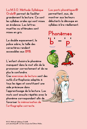 Phonèmes "b" "p" La M.S.O. Méthode Syllabique Orale® permet de faciliter grandement la lecture. Ce sont les syllabes orales qui sont mises en évidence. Les lettres muettes ou atténuées sont mises en gris. Les ponts phonétiques® permettent, eux, de montrer aux lecteurs débutants la découpe en syllabes à lire réellement. Le double espacement, la police sobre, la taille des caractères rendent accessibles aux DYS. L'enfant choisira le phonème manquant dans le mot afin de le prononcer correctement et de ne plus le confondre. Ces exercices de lecture sont des outils d'orthophonie adaptés à tous les âges et constituent une aide précieuse dans l'apprentissage de la lecture. Les mots sont ensuite répétés avec le phonème correspondant afin de favoriser la mémorisation de l'orthographe correcte.