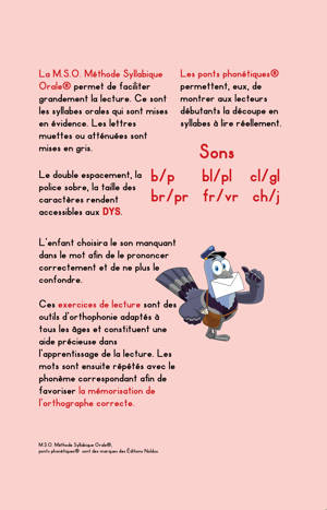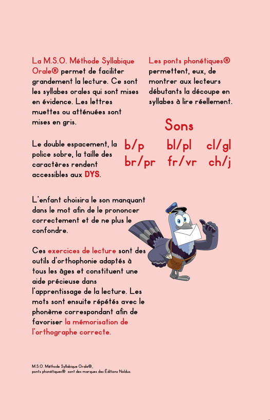 L'enfant choisira le son manquant dans le mot afin de le prononcer correctement et de ne plus le confondre. Ces exercices de lecture sont des outils d'orthophonie adaptés à tous les âges et constituent une aide précieuse dans l'apprentissage de la lecture. Les mots sont ensuite répétés avec le son correspondant afin de favoriser la mémorisation de l'orthographe correcte. La M.S.O. Méthode Syllabique Orale® permet de faciliter grandement la lecture. Ce sont les syllabes orales qui sont mises en évidence. Les lettres muettes ou atténuées sont mises en gris.