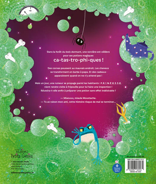 Dans la forêt Au bois dormant, une sorcière est célèbre pour ses potions magiques ca-tas-tro-phi-ques?! Des cornes poussent au mauvais endroit. Les cheveux se transforment en barbe à papa. Et des cadeaux apparaissent quand on ne s'y attend pas?! Mais un jour, une rumeur se propage parmi les habitants : P.R.I.N.C.E.S.S.E. vient rendre visite à Fripouille pour lui faire une inspection?! Réussira-t-elle enfin à préparer une potion sans effet indésirable?? ? Miaouuu, miaule Moustache. Tu as raison mon ami, cette histoire risque de mal se terminer...