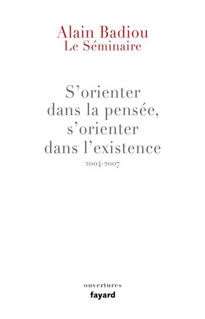 « Le séminaire des années 2004 à 2007 s’articule à la fois à une conjoncture et à une oeuvre en cours : une contre-révolution libérale victorieuse depuis la deuxième moitié des années 1990 et une théorie de la singularité des mondes telle que déployée dans Logiques des mondes, qui paraît en 2006. Pour autant que l’adversaire libéral de toute vérité l’emporte provisoirement, la pensée supporte une dure désorientation. Pour autant qu’il s’agit de penser ce qu’est un monde, et notamment le nôtre – celui de la désorientation –, la tâche est de repérer les appuis pour s’y orienter vers la naissance de vérités neuves. Le but est donc bien de “s’orienter dans la pensée, s’orienter dans l’existence”. D’où que les matériaux examinés dans ce séminaire sont fortement marqués par leur contemporanéité. Ils doivent en effet témoigner de la singularité du monde contemporain. » A. B.