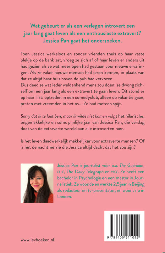 Sorry dat ik te laat ben, maar ik wilde niet komen volgt het hilarische, ongemakkelijke en soms pijnlijke jaar van Jessica Pan, die verslag doet van de extraverte wereld aan alle introverten hier. Is het leven daadwerkelijk makkelijker voor extraverte mensen? Of is het de nachtmerrie die Jessica altijd dacht dat het zou zijn?