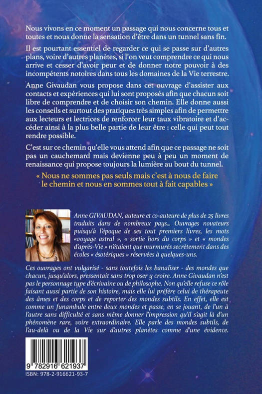 Nous vivons en ce moment un passage qui nous concerne tous et toutes et nous donne la sensation d’être dans un tunnel sans fin. Il est pourtant essentiel de regarder ce qui se passe sur d’autres plans, voire d’autres planètes, si l’on veut comprendre ce qui nous arrive, cesser d’avoir peur et de donner notre pouvoir à des incompétents notoires dans tous les domaines de la Vie terrestre. Anne Givaudan vous propose dans cet ouvrage d’assister aux contacts et expériences qui lui sont proposés afin que chacun soit libre de comprendre et de choisir son chemin. Elle donne aussi les conseils et surtout des pratiques très simples afin de permettre aux lecteurs et lectrices de renforcer leur taux vibratoire et d’accéder ainsi à la plus belle partie de leur être : celle qui peut tout rendre possible. C’est sur ce chemin qu’elle vous attend afin que ce passage ne soit pas un cauchemar mais devienne peu à peu un moment de renaissance qui propose toujours la lumière au bout du tunnel. "Nous ne sommes pas seuls mais il nous appartient de faire le chemin et nous en sommes tout à fait capables » est l’un des messages qu’Anne propose à l'humanité.