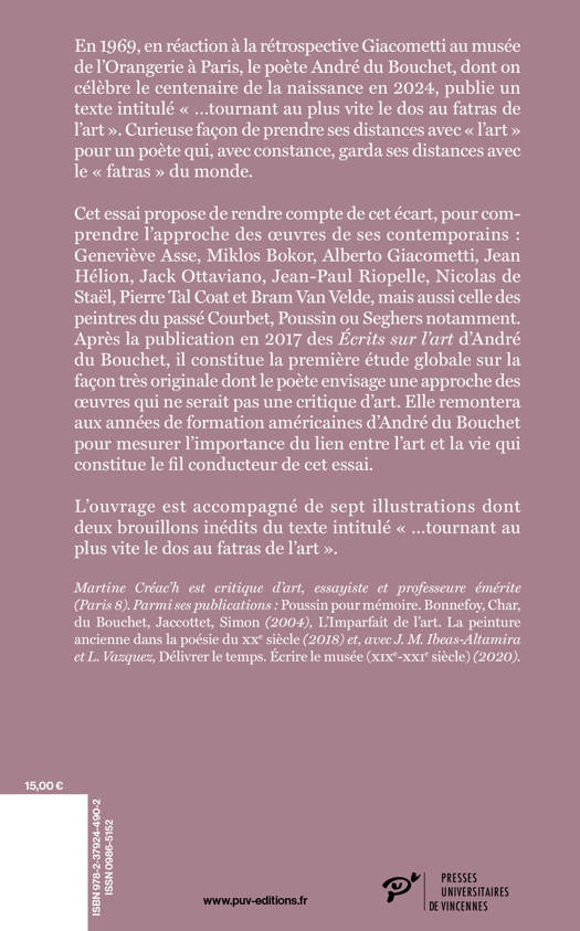 En 1969, en réaction à la rétrospective Giacometti au musée de l’Orangerie à Paris, le poète André du Bouchet, dont on célèbre le centenaire de la naissance en 2024, publie un texte intitulé « …tournant au plus vite le dos au fatras de l’art ». Curieuse façon de prendre ses distances avec « l’art » pour un poète qui, avec constance, garda ses distances avec le « fatras » du monde.