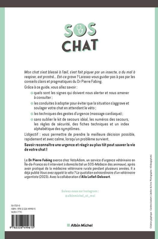 Le Dr Pierre Fabing exerce chez VetoAdom, un service d'urgence vétérinaire en Île-de-France où il intervient à domicile (tel un SOS-Médecin des animaux), après avoir pratiqué de la médecine vétérinaire rurale pendant plusieurs années. Il a déjà publié Vous avez appelé le véto ? Le quotidien extraordinaire d'un vétérinaire urgentiste (2023).