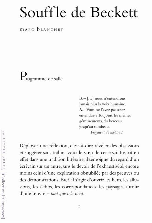 En s'intéressant à "Souffle", pièce la plus courte (une page) et la plus brève (35 secondes) de Samuel Beckett, Marc Blanchet étudie une oeuvre sous-titrée « intermède » où Beckett, sous couvert d'ironie, livre une merveille cristallisant son art. "Souffle" est approché d'abord comme une partition, aux temps d'écriture et de didascalies égaux, à déchiffrer sans référence aux autres pièces ou proses. Puis, dans une deuxième partie, Marc Blanchet traverse les livres de Beckett pou rmettre en écho cette pièce sans comédien à travers l'ensemble des écrits, de Beckett, voyant dans les ordures sur scène qui remplacent toute incarnation humaine « une exaspération du personnage comédien ». une troisième partie, interroge de manière plus vaste l'écriture beckettienne… . Ainsi se dessine un « souffle de Beckett » pour parler d'une écriture qui n'a cessé de dessiner un territoire cohérent dont l'essai de l'écrivain Marc Blanchet montre la vitalité toujours forte en y apportant un nouveau regard. Marc Blanchet, né en 1968, est l'auteur d'une vingtaine d'ouvrages de poésie, récits, proses et essais. il a publié aux éditions de La Lettre volée "L'Éducation des monstre"s (2009) et "Méditations & autres brièvetés" (2012), et chez le même éditeur cette année "Souffle de Beckett" (essai) et "Valses et enterrements".