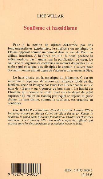 Face à la notion de djihad déformée par des fondamentalistes extrémistes, le soufisme ou mystique de l'Islam apparaît comme un combat dans la voie de Dieu, un djihad intérieur. A la force brutale, le soufi préfère la métamorphose par l'amour, par la purification du coeur . Le hassidisme est la mystique du judaïsme, et le hassid, est l'homme qui, comme le soufi, tend vers le degré de piété supérieur du maître par lequel se répand la grâce divine. L'auteur rend compte dans cet ouvrage des affinités qui existent entre les deux mystiques.