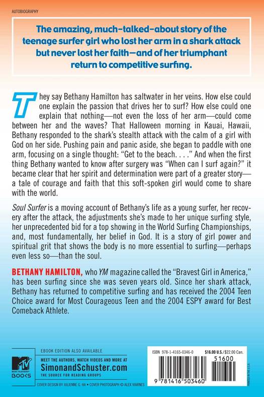 Now a major motion picture! #1 New York Times bestseller! In this moving personal account of faith and fortitude, internationally ranked surfer Bethany Hamilton tells how she survived a shark attack that cost her arm--but not her spirit.They say Bethany Hamilton has saltwater in her veins. How else could one explain the passion that drives her to surf? How else could one explain that nothing--not even the loss of her arm--could come between her and the waves? That Halloween morning in Kauai, Hawaii, Bethany responded to the shark's stealth attack with the calm of a girl with God on her side. Pushing pain and panic aside, she began to paddle with one arm, focusing on a single thought: "Get to the beach." And when the first thing Bethany wanted to know after surgery was "When can I surf again?," it became clear that her spirit and determination were part of a greater story--a tale of courage and faith that this soft-spoken girl would come to share with the world. Soul Surfer is a moving account of Bethany's life as a young surfer, her recovery after the attack, the adjustments she's made to her unique surfing style, her unprecedented bid for a top showing in the World Surfing Championships, and, most fundamentally, her belief in God. It is a story of girl power and spiritual grit that shows the body is no more essential to surfing--perhaps even less so--than the soul.
