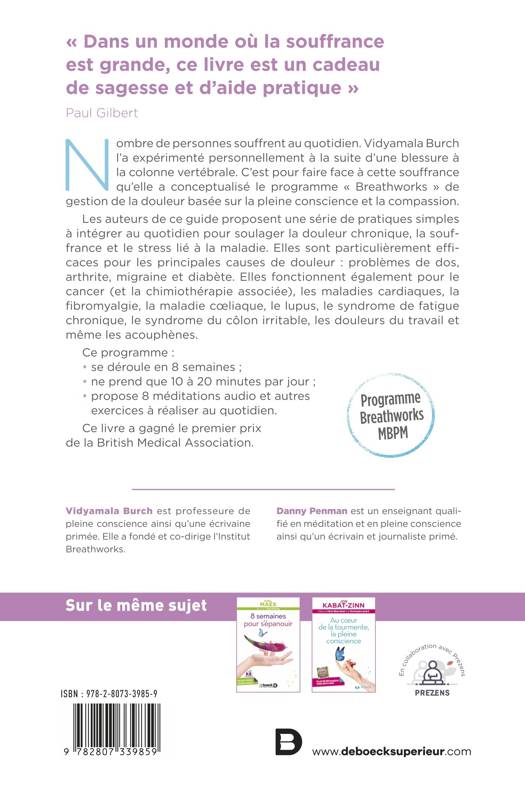 Se basant sur la pleine conscience et la compassion, les auteurs proposent une série de pratiques simples à intégrer au quotidien pour soulager la douleur chronique, la souffrance et le stress lié à la maladie. En effet, le plus souvent, la douleur s’impose à nous. La souffrance, par contre, peut-être apaisée voire même disparaître.