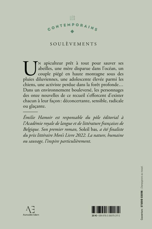 Un apiculteur prêt à tout pour sauver ses abeilles, une mère disparue dans l'océan, un couple piégé en haute montagne sous des pluies diluviennes, une adolescente élevée parmi les chiens, une activiste perdue dans la forêt profonde... Dans un environnement bouleversé, les personnages des onze nouvelles de ce recueil s'efforcent d'exister chacun à leur façon: déconcertante, sensible, radicale ou glaçante. Emilie Hamoir est éditrice à l'Académie royale de langue et de littérature françaises de Belgique. Son premier roman, Soleil bas, a été finaliste du prix littéraire Mon's Livre 2022. La nature, humaine ou sauvage, l'inspire particulièrement.