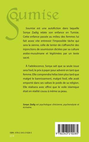 Soumise est une autofiction dans laquelle Sonya Zadig relate son enfance en Tunisie. Cette enfance passée au milieu des femmes lui fait assez vite entrevoir l'impossible tâche qui sera la sienne, celle de tenter de s'affranchir des injonctions de soumission dictées par sa culture arabo-musulmane et légitimées par un texte sacré. À l'adolescence, Sonya sait que sa seule issue sera l'exil, le prix à payer pour advenir en tant que femme. Elle comprendra hélas bien plus tard que malgré le bannissement, malgré l'exil, elle avait emporté dans ses valises le poids de sa religion. Elle réalisera avec effroi que le voile islamique était en réalité cousu à même sa peau.