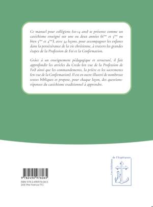 Ce manuel pour collégiens (10 - 14 ans) se présente comme un catéchisme enseigné sur une ou deux années (6ème et 5ème ou bien 5ème et 4ème), avec 34 leçons, pour accompagner les enfants dans la persévérance de la vie de foi, à travers les grandes étapes de la Profession de Foi et la Confirmation. Il se propose, à travers un enseignement systématique, pédagogique et structuré, illustré de textes bibliques, avec des questions/réponses du catéchisme traditionnel et enrichi de développements sur des thèmes connexes, de faire approfondir les articles du Credo (en vue de la Profession de Foi) ainsi que les commandements, la prière et les sacrements (en vue de la Confirmation).