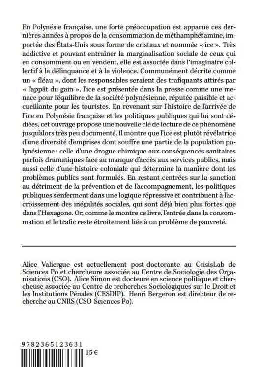 En Polynésie française, une forte préoccupation est apparue à propos de la consommation de méthamphétamine, importée des États-Unis sous forme de cristaux et nommée « ice ». Vendue à prix d’or sur le marché polynésien (80€ pour une dose d’environ 0,04 gramme), l’ice s’est répandue dans divers segments de la population, y compris certains milieux populaires. Très addictive, elle provoque la marginalisation sociale de ceux qui en consomment et alimente un commerce particulièrement lucratif. Associée dans l’imaginaire collectif à la délinquance et à la violence, cette drogue est communément décrite comme un « fléau » qui menacerait l’équilibre de la société polynésienne, réputée paisible et pacifique. Cet ouvrage propose une analyse de ce phénomène jusqu’alors très peu documenté et offre une nouvelle clef de lecture de la panique morale qu’il a engendrée dans la société polynésienne, déjà ébranlée par la colonisation puis l’arrivée des essais nucléaires dans les années 1960. À partir d’une enquête menée entre 2019 et 2021 auprès de consommateurs, de trafiquants et de professionnels (services de l’ordre, professionnels de santé, responsables associatifs, etc.), ce livre montre que le problème de l’ice en Polynésie française est révélateur de l’état de crise sociale et politique que traversent les Outre-mer français, mis en lumière par la récente pandémie. Dans un contexte où les inégalités sociales sont particulièrement fortes et où l’État providence est inexistant, l’ice incarne en effet l’aspiration à la modernité d’une partie de la population et révèle une occidentalisation des modes de vie. De plus, la gestion de la crise de l’ice est significative des derniers développements du colonialisme dans les Outre-mer. Au sein du gouvernement bicéphale, un déséquilibre transparaît en effet entre l’État régalien, chargé notamment de la répression du trafic, et le gouvernement local, conduisant de façon autonome et avec peu de moyens les politiques sociales. Dans le cas de la lutte contre l’ice, comme d’ailleurs lors de la gestion de la pandémie, l’État central s’impose comme le seul acteur capable de gouverner en temps de crise et assoit ainsi sa domination sur un territoire tenté par l’indépendance. Table des matières Introduction Chapitre 1 : L’essor d’un problème public Un premier chapitre retrace le développement de la consommation d’ice et la mise à l’agenda politique de cette thématique. Si cette drogue a commencé à se répandre progressivement dès les années 2000, ce n’est qu’à partir de la seconde moitié des années 2010 que ce phénomène apparait à l’agenda médiatique et politique. Cet intérêt soudain pour cette thématique s’explique à la fois par une progression importante de la consommation et par l’apparition de nouveaux indicateurs pour l’observer. Le chapitre montre que la consommation est érigée au rang de problème public dès lors qu’il devient évident qu’elle n’est pas uniquement une « drogue de riches », mais qu’elle se répand également dans les milieux populaires et chez les jeunes. En raison du prix particulièrement élevé de ce produit et de son caractère très addictif, les conséquences sociales de la consommation sont en effet particulièrement lourdes : appauvrissement, endettement, prostitution, vols, mais aussi participation au trafic. Chapitre 2 : L’ice, symptôme de l’occidentalisation ? Un deuxième chapitre montre que le succès de l’ice en Polynésie française s’explique par l’attrait, pour une partie de la population polynésienne, de la modernité occidentale. L’ice est considérée comme un produit de luxe : son prix particulièrement élevé lui confère une haute valeur symbolique. De plus, l’ice est associée aux États-Unis, d’où elle est importée, et son champ lexical est quasi exclusivement anglo-saxon. Plus généralement, les effets recherchés par les consommateurs reflètent les injonctions sociales de la modernité occidentale : l’ice est une drogue qui permet d’atteindre des performances (ne pas dormir pour faire la fête, tenir au travail, être performant sexuellement, etc.). Par ailleurs, beaucoup de trafiquants exposent leur enrichissement en achetant des biens de consommation de luxe (notamment des voitures et motos américaines, des jet skis, etc.). La panique morale générée par la consommation d’ice s’explique d’ailleurs en grande partie par le fait que cette drogue symbolise ce qui est considéré comme le délitement des traditions polynésiennes au profit de valeurs occidentales et du capitalisme. Chapitre 3 : Une réaction de l’État régalien et colonial Un troisième chapitre montre que la réponse publique est avant tout répressive : même la prévention est largement monopolisée par