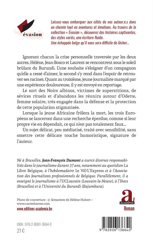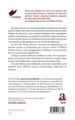 Partir loin de chez soi et découvrir d'autres réalités, fussent-elles atroces, permet peut-être de se retrouver soi-même. Hélène, Jean-Bosco et Laurent vont en faire l'expérience lors d'un court séjour au Burundi. Ignorant la crise personnelle que chacun d'eux traverse, ils vont trouver des réponses au contact d'Odette, Noire albinos. Elle frôlera la mort lors d'un périple en province tandis que les trois Européens se lancent dans une recherche désespérée pour la retrouver.