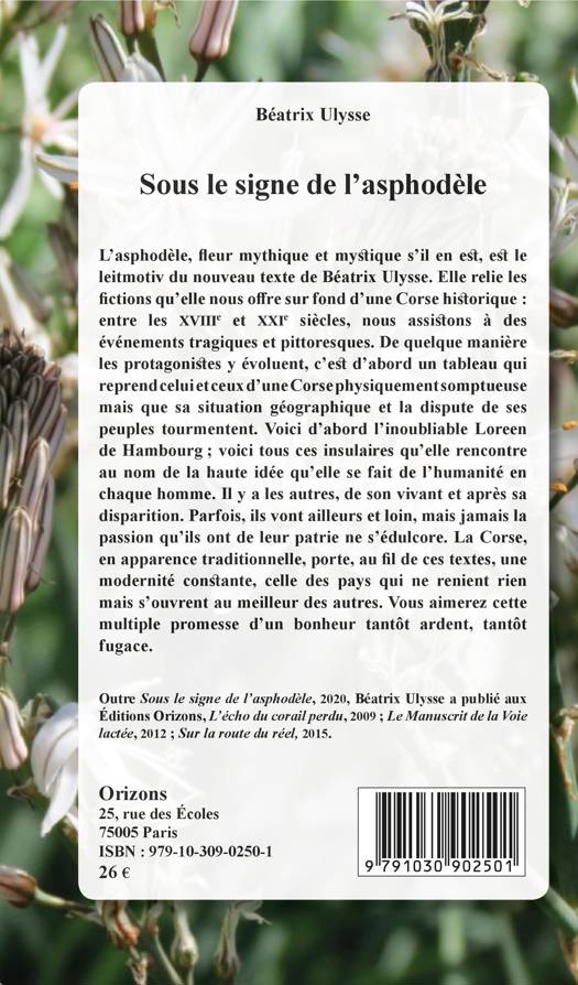 L'asphodèle, fleur mythique et mystique s'il en est, est le leitmotiv du nouveau texte de Béatrix Ulysse. Elle relie les fictions qu'elle nous offre sur fond d'une Corse historique : entre les XVIIIe et XXIe siècles, nous assistons à des événements tragiques et pittoresques. De quelque manière les protagonistes y évoluent, c'est d'abord un tableau qui reprend celui et ceux d'une Corse physiquement somptueuse mais que sa situation géographique et la dispute de ses peuples tourmentent. La Corse, en apparence traditionnelle, porte, au fil de ces textes, une modernité constante, celle des pays qui ne renient rien mais s'ouvrent au meilleur des autres. Vous aimerez cette multiple promesse d'un bonheur tantôt ardent, tantôt fugace.