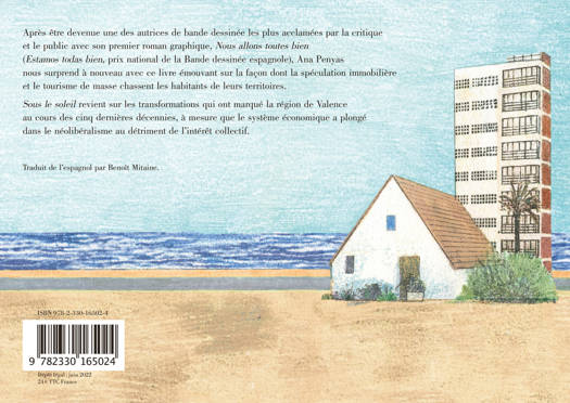 Sous le soleil dépeint les effets de la politique touristique espagnole entre 1969 et 2019 dans les alentours de Valencia, sur la Costa Blanca. A travers l'histoire d'une famille sur trois générations, de l'ère franquiste jusqu'au triomphe du néolibéralisme, on y voit la disparition des activités traditionnelles telles que la pêche et l'agriculture, et les conséquences dévastatrices de la bétonisation des côtes, de la spéculation immobilière et du développement du tourisme de masse. Avec ce drame humain, Ana Penyas s'impose comme une autrice de premier plan, portant un regard acéré sur notre monde. Original et très élaboré, le traitement graphique mêle plusieurs styles et techniques.