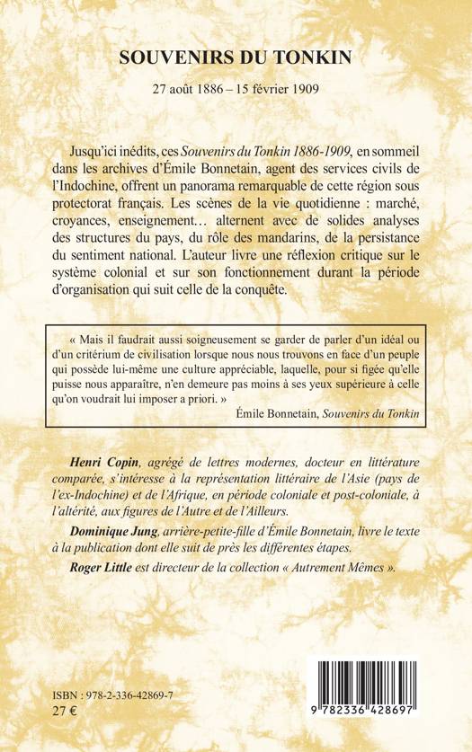 Souvenirs du Tonkin 1886-1909, en sommeil dans les archives d'Émile Bonnetain, agent des services civils de l'Indochine, offrent un panorama remarquable de cette région sous protectorat français. Les scènes de la vie quotidienne: marché, croyances, enseignement... alternent avec de solides analyses des structures du pays, du rôle des mandarins, de la persistance du sentiment national. L'auteur livre une réflexion critique sur le système colonial et sur son fonctionnement durant la période d'organisation qui suit celle de la conquête.