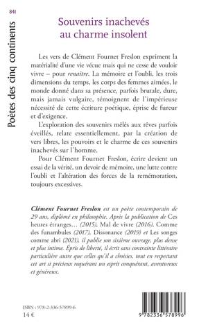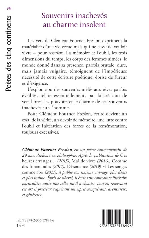 Les vers de Clément Fournet Freslon expriment la matérialité d'une vie vécue mais qui ne cesse de vouloir vivre - pour renaître. La mémoire et l'oubli, les trois dimensions du temps, les corps des femmes aimées, le monde donné dans sa présence, parfois brutale, dure, mais jamais vulgaire, témoignent de l'impérieuse nécessité de cette écriture poétique, éprise de fureur et d'exigence. L'exploration des souvenirs mêlés aux rêves parfois éveillés, relate essentiellement, par la création de vers libres, les pouvoirs et le charme de ces souvenirs inachevés sur l'homme. Pour Clément Fournet Freslon, écrire devient un essai de la vérité, un devoir de mémoire, une lutte contre l'oubli et l'altération des forces de la remémoration, toujours excessives.