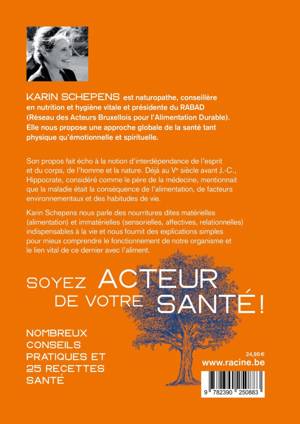 Karin Schepens nous parle des nourritures dites matérielles (alimentation) et immatérielles (sensorielles, affectives, relationnelles) indispensables à la vie et nous fournit des explications simples pour mieux comprendre le fonctionnement de notre organisme et le lien vital de ce dernier avec l'aliment.