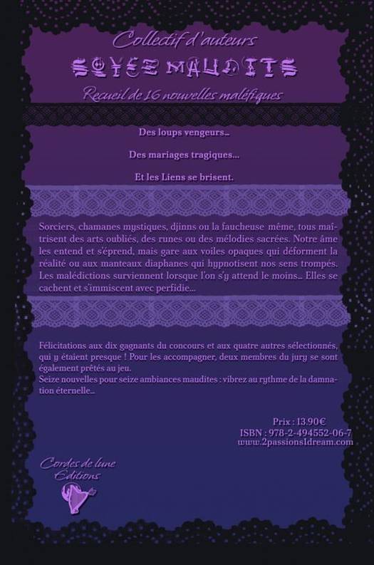 Des loups vengeurs… Des mariages tragiques... Et les Liens se brisent. --- Sorciers, chamanes mystiques, djinns ou la faucheuse même, tous maîtrisent des arts oubliés, des runes ou des mélodies sacrées. Notre âme les entend et s’éprend, mais gare aux voiles opaques qui déforment la réalité ou aux manteaux diaphanes qui hypnotisent nos sens trompés. Les malédictions surviennent lorsque l’on s’y attend le moins… Elles se cachent et s’immiscent avec perfidie... --- Félicitations aux dix gagnants du concours et aux quatre autres sélectionnés, qui y étaient presque ! Pour les accompagner, deux membres du jury se sont également prêtés au jeu. Seize nouvelles pour seize ambiances maudites : vibrez au rythme de la damnation éternelle…