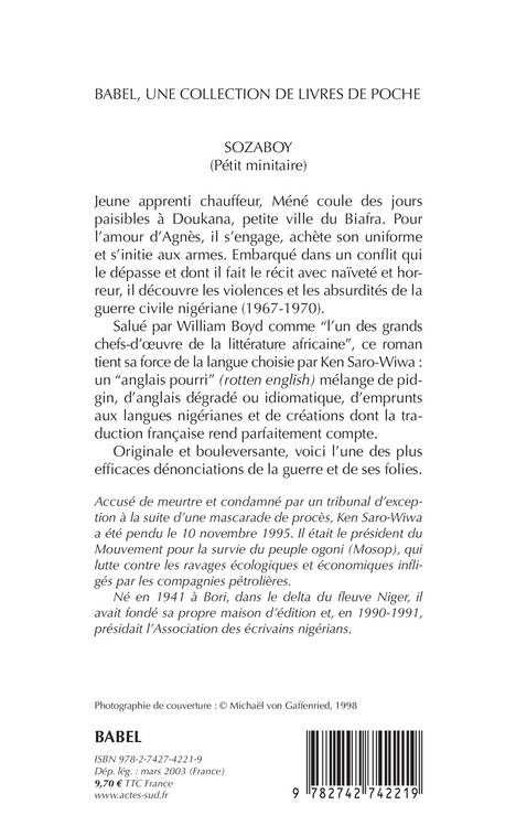 Pour l'amour d'Agnès, Méné s'engage, achète son uniforme, s'initie aux armes et devient Sozaboy, pétit minitaire. Embarqué dans un conflit qui le dépasse, il découvre les violences et les absurdités de la guerre civile nigériane (1967-1970).