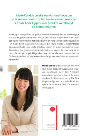 'De eerste opruimcelebrity van de wereld is opgestaan.' - Aaf Brandt Corstius in Volkskrant Magazine ‘Was ik al enthousiast over haar eerste boek ‘Opgeruimd!’ nu ben ik helemaal blij geworden door de praktische aanwijzingen van de Japanse Marie Kondo. Niet alleen rust in je kast, maar ook in je hart!' - Catherine Keyl 'De ode aan het ontspullen van deze Japanse expert is simpel en makkelijk te volgen.' - Vogue.com 'Marie Kondo brengt haar opgeruimde manifest als een soort Zen nanny: opbeurend en levendig.' - The New York Times 'Het is een inspirerende, geïllustreerde handleiding om je huis te ‘ontspullen’ en specifieke items in je hele huis te organiseren.' - De Zondag 'Maart luidt de lente in, een seizoen waar we allemaal hard naar uitkijken. Wie lente zegt, denkt (soms) ook schoonmaak. Vervelend? Ja, maar ook bevrijdend, en niet alleen letterlijk. Vraag het maar aan Marie Kondo.' - Plus Magazine