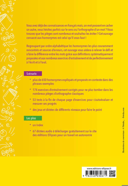 Vous avez déjà des bonnes connaissances en français mais, un mot pouvant en cacher un autre, vous hésitez parfois sur le sens ou l’orthographe d’un mot ? Vous trouvez que les pièges sont nombreux et souhaitez les éviter ? Cet ouvrage consacré aux homonymes est celui qu’il vous faut !