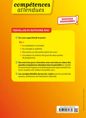 Conforme à la réforme du Bac 2021. Travailler en autonomie avec un cours approfondi (en + le vocabulaire à connaître ; les concepts logique à maîtriser) ; des exercices classés par compétences attendues avec une mise en valeur des grandes compétences du socle commun (ex. chercher, analyser, représenter, etc.) et les corrigés détaillés de tous les sujets avec les conseils des auteurs, professeurs de lycée.