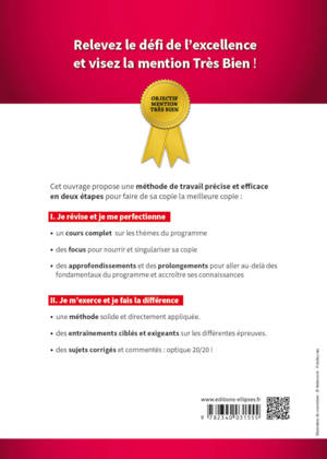 Conforme à la réforme du Bac 2021. Une méthode de travail précise et efficace en deux étapes pour faire de sa copie la meilleure copie :I. Je révise et je me perfectionne• un cours complet sur l’intégralité du programme• des focus pour nourrir et singulariser sa copie• des approfondissements et des prolongements pour aller au-delà des fondamentaux du programme et accroître ses connaissances II. Je m’exerce et je fais la différence• une méthode solide et directement appliquée : questions possibles au bac, mobilisation des connaissances...• des entraînements ciblés et exigeants sur les différentes épreuves écrites : dissertation et épreuve composée• de nombreux exercices et des sujets d’annales entièrement corrigés et commentés : optique 20/20!