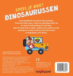 Cool speelboek boordevol dino-weetjes.Vouw het boek open, maak de speelfiguurtjes los en laat je verbeelding de vrije loop.Met dit boek leer je tellen, speel je een zoek-en-vindspelletje en maak je kennis met 50 termen en begrippen over dino’s.