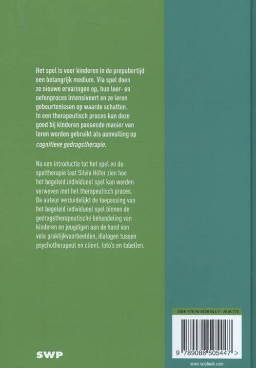 Het spel is voor kinderen in de prepubertijd een belangrijk medium. Via spel doen ze nieuwe ervaringen op, hun leer- en oefenproces intensiveert en ze leren gebeurtenissen op waarde schatten. In een therapeutisch proces kan deze goed bij kinderen passende manier van leren worden gebruikt als aanvulling op cognitieve gedragstherapie. Na een introductie tot het spel en de speltherapie laat Silvia Höfer zien hoe het begeleid individueel spel kan worden verweven met het therapeutisch proces. De auteur verduidelijkt de toepassing van het begeleid individueel spel binnen de gedragstherapeutische behandeling van kinderen en jeugdigen aan de hand van vele praktijkvoorbeelden, dialogen tussen psychotherapeut en cliënt, foto's en tabellen. De eerste twee hoofdstukken in Speltherapie vormen een inleiding op het thema spel vanuit ontwikkelingspsychologisch, neurobiologisch en spelpsychologisch perspectief en leggen daarmee een belangrijke basis voor de speltherapeutische praktijk binnen de gedragstherapie. In hoofdstuk 3 worden vervolgens de traditionele speltherapeutische methoden gepresenteerd die gebruikt worden bij het begeleid individueel spel. Hoofdstuk 4 slaat een brug tussen kinder- en jeugdgedragstherapie en therapeutisch spel, en toont in beginsel aan hoe zowel het op behoefte georiënteerde en op emotie gerichte spel alsook cognitieve en operante aspecten in de therapeutische spelbegeleiding verenigd worden. De hoofdstukken 5-9 beschrijven het concreet werken met het begeleid individueel spel. Hoofdstuk 10 bevat voorbeelden van praktijkgevallen die het werken met begeleid individueel spel verduidelijken.