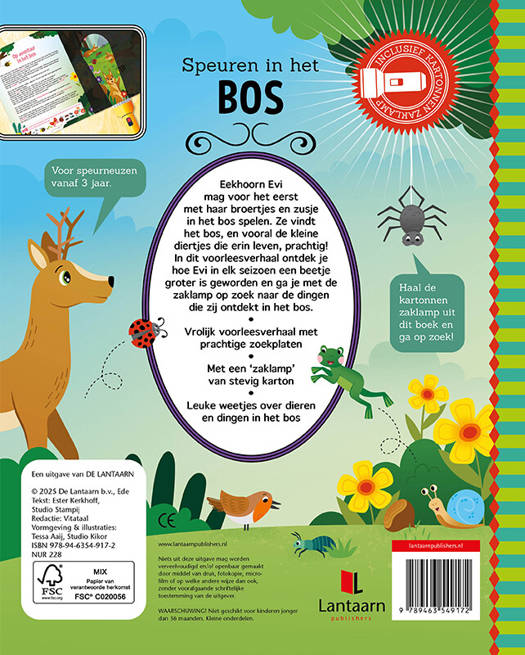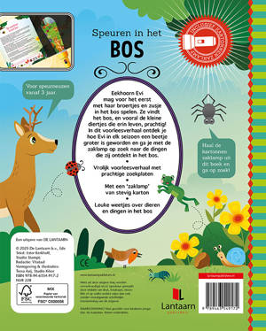 Het boek begint met leuke weetjes en feitjes over het bos. Hier kom je ook de kartonnen zaklamp tegen. Deze zaklamp heb je nodig voor de pagina's die volgen. In het verhaal staan namelijk gekleurde woorden, die je op de rechterpagina kunt zoeken. Maar dat lukt alleen als je de zaklamp gebruikt! Schuif 'm onder de zwarte pagina en je ziet dat er een lichtbundel ontstaat, waarmee je kunt zien wat Evi allemaal tijdens haar reis tegenkomt.