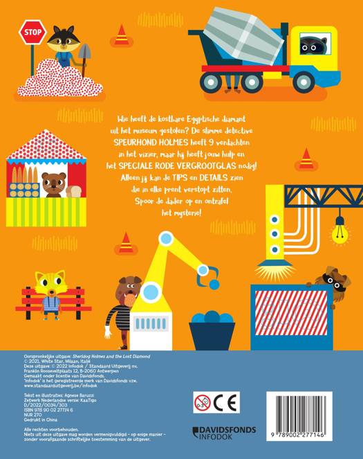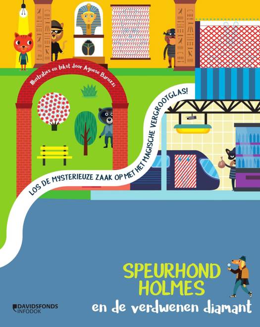 Wie heeft de kostbare Egyptische diamant uit het museum gestolen? De slimme detective speurhond Holmes heeft 9 verdachten in het vizier, maar hij heeft jouw hulp en het speciale rode vergrootglas nodig! Neem het magische vergrootglas uit de kaft en speur naar geheime aanwijzingen die met speciale inkt verborgen zijn in de bladzijden van dit boek! Alleen jij kan de tips en details zien die in elke prent verstopt zitten. Spoor de dader op en ontrafel het mysterie! Volg de sporen door de stad, de metro, het onderzoekslab, het park... om alle info te verzamelen en de schuldige van de diefstal te vatten. De spelletjes stimuleren het concentratievermogen en logische denken van kinderen en de visuele vaardigheden.