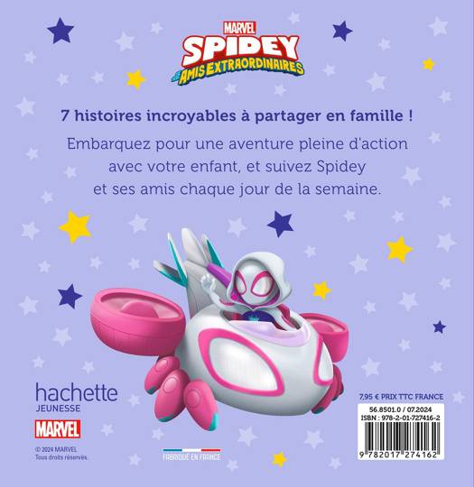 Une histoire chaque soir de la semaine, pour un moment de lecture en compagnie de Spidey et ses amis extraordinaires ! – Un recueil de 7 histoires richement illustré et facile à lire, pour vivre les incroyables aventures des petits héros Spidey, Ghosty et Spin. – Une maquette claire et efficace, avec des textes courts et rythmés.