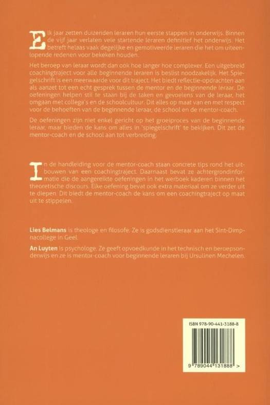 Het beroep van leraar wordt dan ook hoe langer hoe complexer. Een uitgebreid coachingtraject voor alle beginnende leraren is beslist noodzakelijk. Het Spiegelschrift is een meerwaarde voor dit traject. Het biedt refl ectie-opdrachten aan als aanzet tot een echt gesprek tussen de mentor en de beginnende leraar. De oefeningen helpen stil te staan bij de taken en gevoelens van de leraar, het omgaan met collega’s en de schoolcultuur. Dit alles op maat van en met respect voor de behoeften van de beginnende leraar, de school en de mentor-coach. De oefeningen zijn niet enkel gericht op het groeiproces van de beginnende leraar, maar bieden de kans om alles in ‘spiegelschrift’ te bekijken. Dit zet de mentor-coach en de school aan tot verbreding. In de handleiding voor de mentor-coach staan concrete tips rond het uitbouwen van een coachingtraject. Daarnaast bevat ze achtergrondinformatie die de aangereikte oefeningen in het werboek kaderen binnen het theoretische discours. Elke oefening bevat ook extra materiaal om ze verder uit te diepen. Dit biedt de mentor-coach de kans om een coachingtraject op maat uit te stippelen.