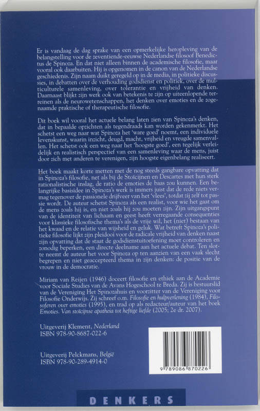 Er is vandaag de dag sprake van een opmerkelijke heropleving van de belangstelling voor de zeventiende-eeuwse Nederlandse filosoof Benedictus de Spinoza. En dat niet alleen binnen de academische filosofie, maar vooral ook daarbuiten. Hij is opgenomen in de canon van de Nederlandse geschiedenis. Zijn naam duikt geregeld op in de media, in politieke discussies, in debatten over de verhouding godsdienst en politiek, over de multiculturele samenleving, over tolerantie en vrijheid van denken. Daarnaast blijkt zijn werk ook van betekenis te zijn op uiteenlopende terreinen als de neurowetenschappen, het denken over emoties en de zogenaamde praktische of therapeutische filosofie. Dit boek wil vooral het actuele belang laten zien van Spinoza’s denken, dat in bepaalde opzichten als tegendraads kan worden gekenmerkt. Het schetst een weg naar wat Spinoza het ‘ware goed’ noemt, een individuele levenskunst, waarin inzicht, deugd, macht, vrijheid en vreugde samenvallen. Het schetst ook een weg naar het ‘hoogste goed’, een tegelijk verleidelijk en realistisch perspectief van een samenleving waar de mens, juist door zich met anderen te verenigen, zijn hoogste eigenbelang realiseert. Het boek maakt korte metten met de nog steeds gangbare opvatting dat in Spinoza’s filosofie, net als bij de Stoïcijnen en Descartes met hun sterk rationalistische inslag, de ratio de emoties de baas zou kunnen. Een belangrijke basisidee in Spinoza’s werk is immers juist dat de rede niets vermag tegenover de passionele drijfveer van het ‘vlees’, totdat zij zelf tot passie wordt. De auteur schetst Spinoza als een realist, voor wie het gaat om de mens zoals hij is, en niet zoals hij zou moeten zijn. Zijn uitgangspunt van de identiteit van lichaam en geest heeft verregaande consequenties voor klassieke filosofische thema’s als de vrije wil, het (niet) bestaan van het kwaad en de relatie van wijsheid en geluk. Wat betreft Spinoza’s politieke filosofie lijkt zijn pleidooi voor de radicale vrijheid van denken naast zijn opvatting dat de staat de godsdienstuitoefening moet controleren en zonodig beperken, een directe deelname aan het actuele debat. Ten slotte neemt de auteur het voor Spinoza op ten aanzien van een vaak slecht begrepen en niet geaccepteerd thema in zijn denken: de positie van de vrouw in de democratie. Miriam van Reijen (1946) verzorgt een eigen opleiding Filosofie in de Praktijk op de Internationale School voor Wijsbegeerte in Leusden en houdt zich al jaren intensief bezig met Spinoza, met name met de praktische kant van zijn filosofie. Zij geeft regelmatig lezingen, workshops, leesgroepen en cursussen over de praktische filosofie van hem en van de Stoïcijnse filosofen. Zij schreef verder onder meer Emoties. Van Stoïcijnse apatheia tot heftige liefde (2005) en Spinoza in bedrijf. Van passie naar actie (2013).