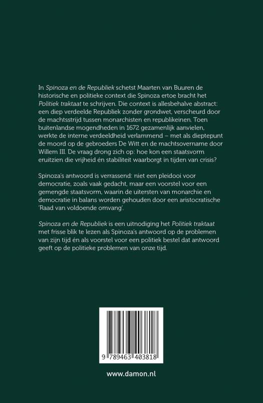 In 'Spinoza en de Republiek' schetst Maarten van Buuren de historische en politieke context die Spinoza ertoe bracht het 'Politiek traktaat' te schrijven. Die context is allesbehalve abstract: een diep verdeelde Republiek zonder grondwet, verscheurd door de machtsstrijd tussen monarchisten en republikeinen. Toen buitenlandse mogendheden in 1672 gezamenlijk aanvielen, werkte de interne verdeeldheid verlammend – met als dieptepunt de moord op de gebroeders De Witt en de machtsovername door Willem III. De vraag drong zich op: hoe kon een staatsvorm eruitzien die vrijheid én stabiliteit waarborgt in tijden van crisis?